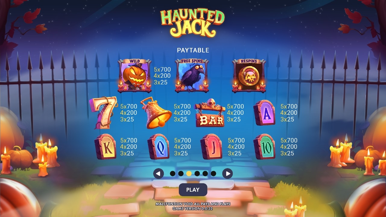Haunted Jack propõe acionar um bônus de até oito giros grátis ao acertar três símbolos Raven no tabuleiro 5x3 nas colunas 1, 3 e 5. Os símbolos Raven Free Spins se transformam em wilds empilhados até o bônus terminar, concedendo mais linhas de vitória.