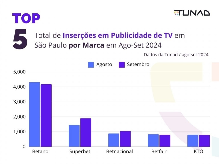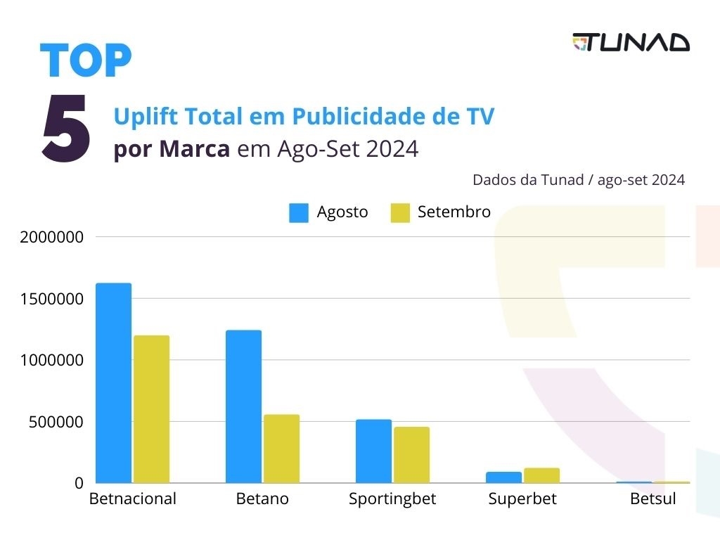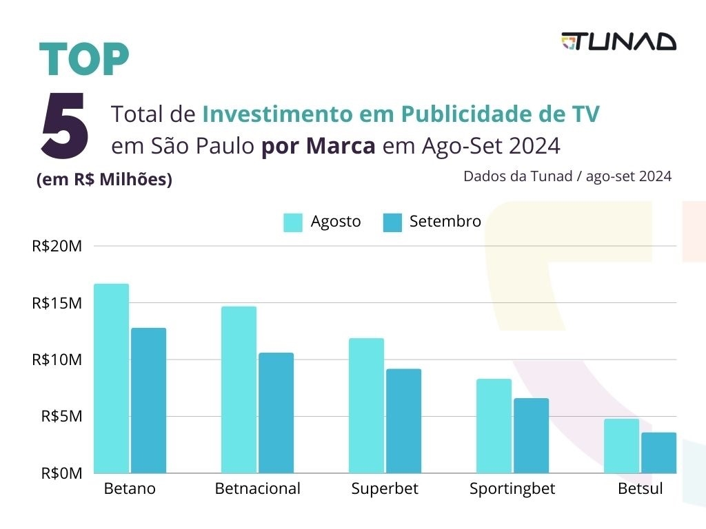 Em ambos os meses, Betano, Superbet, Betnacional, Sportingbet e Betsul figuraram entre as marcas que mais investiram. A Betano liderou em agosto, com um aporte publicitário de R$ 16,7 milhões, seguido de perto pela Betnacional com R$ 14,7 milhões.