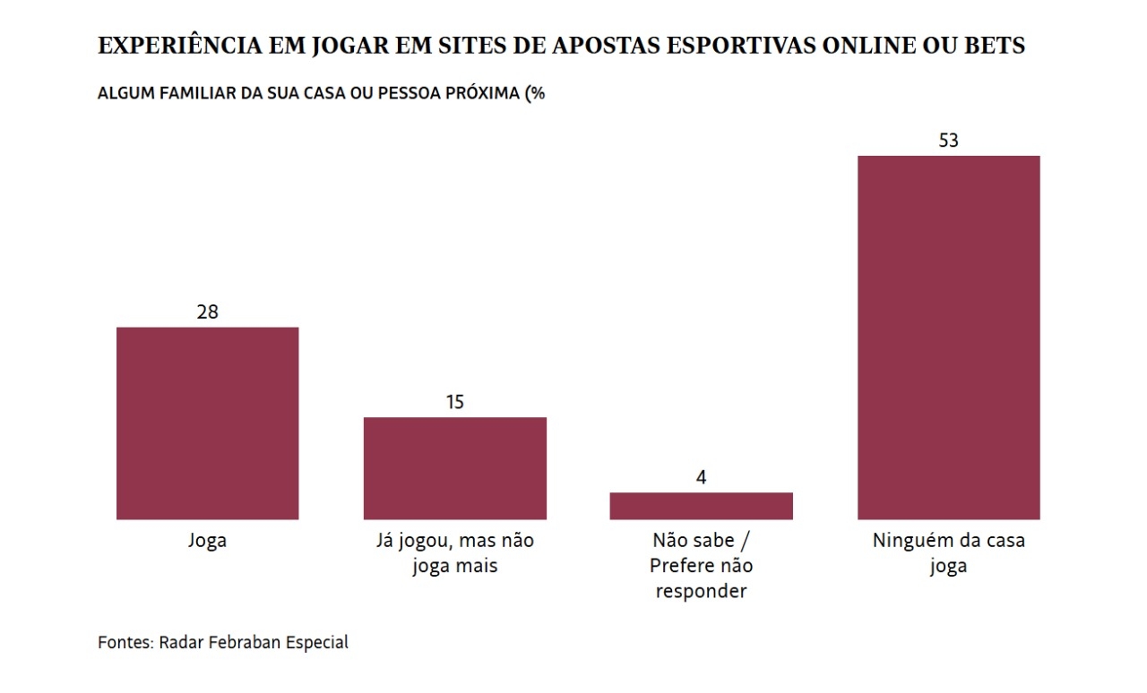 A pesquisa aponta que 40% dos entrevistados declararam que jogam ou têm alguém em casa que aposta nas bets. Outros 21% afirmam terem deixado de jogar.