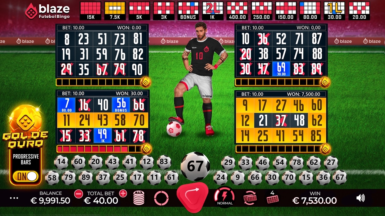 A temática do futebol em um jogo totalmente personalizado para a marca incorpora elementos dinâmicos e icônicos projetados para o game Blaze Futebol Bingo, tais como: