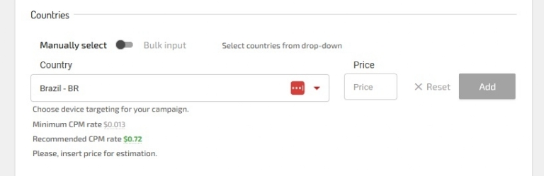 Ao iniciar suas campanhas iGaming, basta definir o lance mínimo ou seguir as sugestões do Traffic Estimator (Estimador de Tráfego) da Adsterra.
