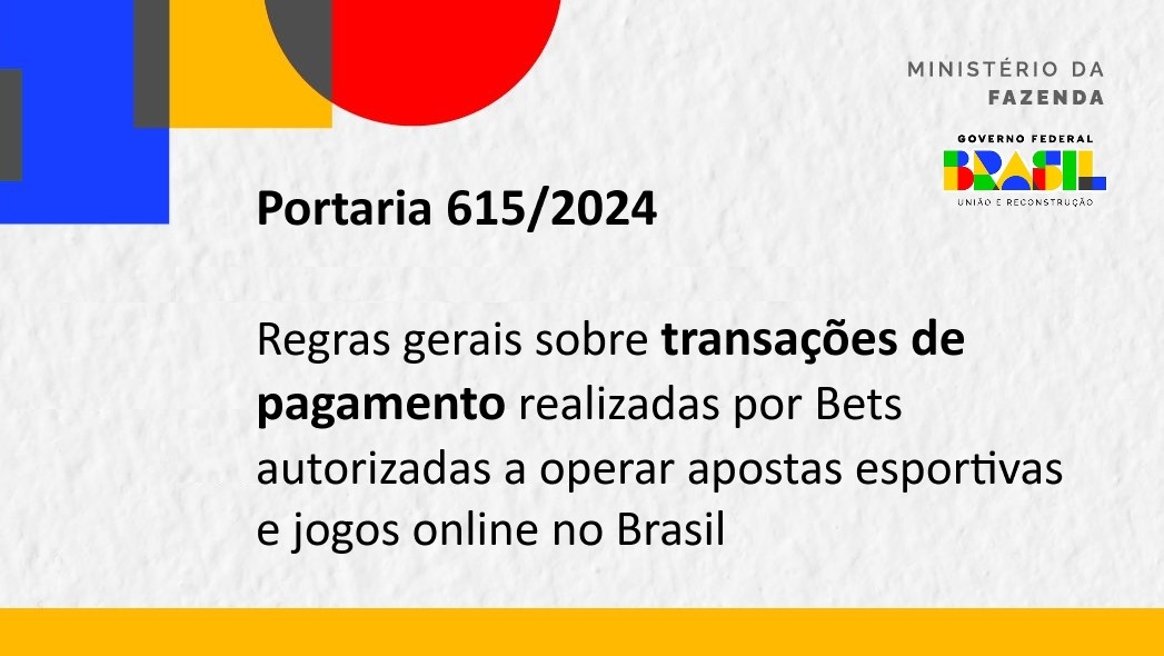 A Portaria 615 da Secretaria de Prêmios e Apostas do Ministério da Fazenda estabelece as regras gerais para transações de pagamento em apostas esportivas e jogo online. O documento define termos como apostas em aberto, contas cadastradas, conta gráfica, conta transacional, e sessão de jogo online.