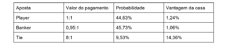 Os pagamentos no bacará estão resumidos na tabela abaixo.