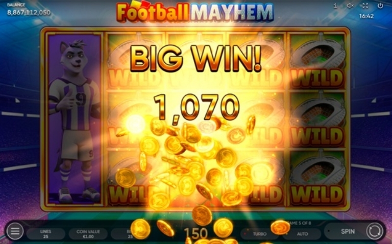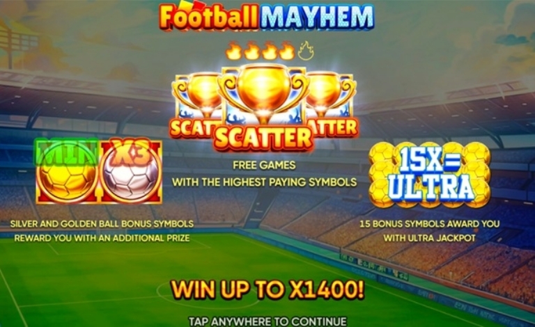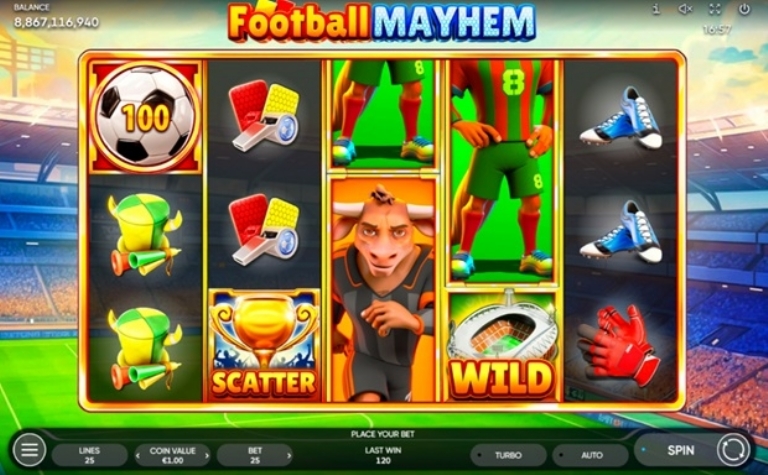 Football Mayhem é um slot de 5 rolos e 3 linhas com 25 linhas de pagamento. Jogadores de futebol são os símbolos principais e aparecem empilhados tanto no jogo principal quanto nos Jogos Grátis. Dependendo de onde o rolo parar, o jogador pode ver o símbolo principal inteiro ou apenas uma parte dele.