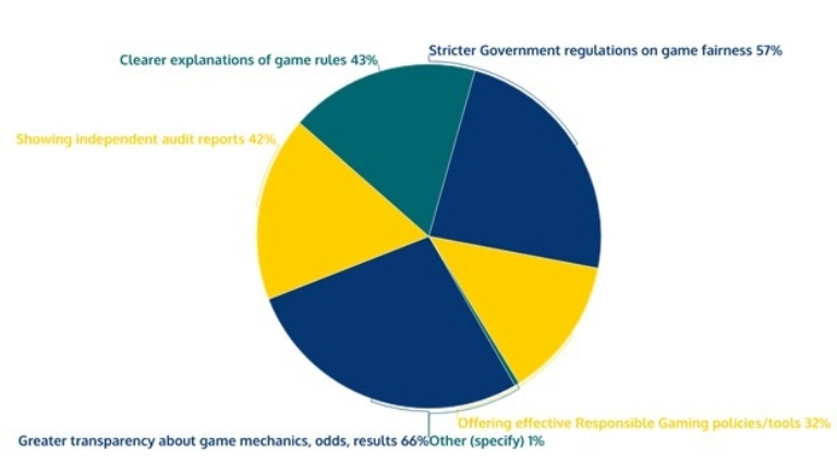 66% acreditam que uma maior transparência sobre a mecânica dos jogos, probabilidades e resultados é o caminho a seguir, seguida por regulamentações governamentais mais rigorosas sobre a imparcialidade dos jogos (57%) - enquanto ações como uma explicação mais clara das regras do jogo (43%), relatórios de auditoria independentes (42%) e políticas e ferramentas eficazes de jogo responsável (32%) também são fortemente mencionada.