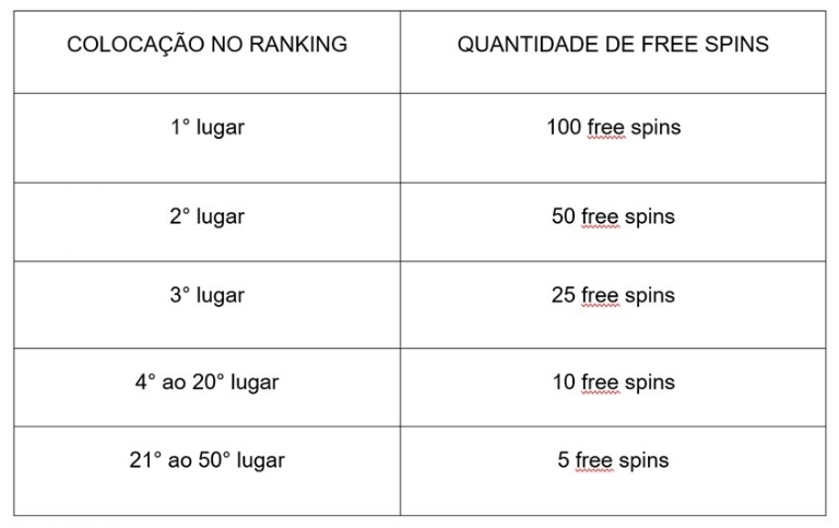 Os 50 primeiros usuários do ranking diário, vão receber free spins de R$ 1 em jogos do cassino determinados para cada dia. A distribuição de free spins acontecerá para da seguinte maneira: