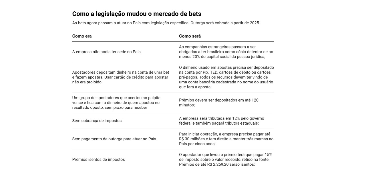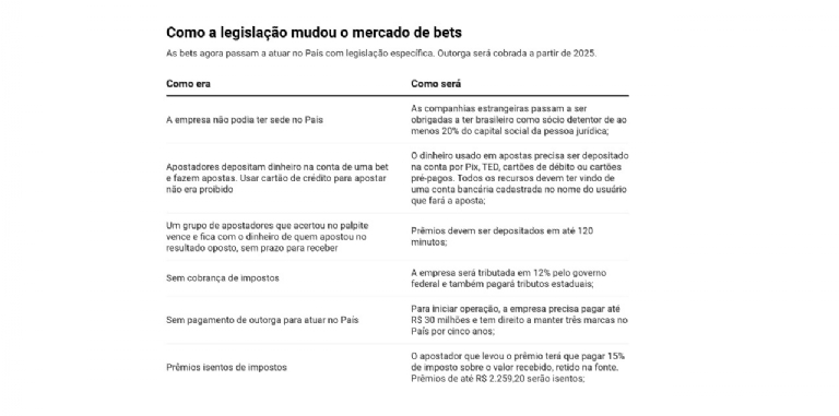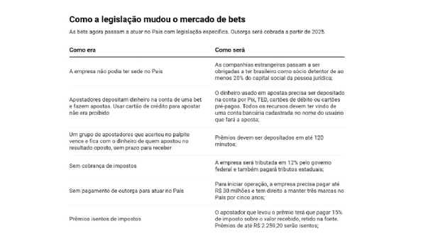 As empresas, por regra antes estrangeiras, passaram a ter a necessidade de um sócio brasileiro, dono de ao menos 20% do capital social do negócio. As propagandas que prometiam ganhos fáceis ou eram direcionadas a menores de idade passaram a ser proibidas. Com a tributação, a estimativa do governo é arrecadar R$ 12 bilhões em 2024.