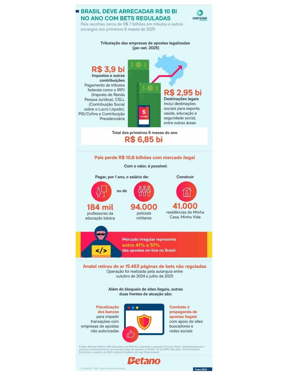 Em relação à contribuição fiscal, os dados da Receita Federal mostram que somente nos primeiros nove meses de 2025, o recolhimento tributário das bets reguladas chegou a R$ 6,85 bilhões. Desse total, parte foi direcionada ao pagamento de impostos e contribuições e outro montante teve como fim aportes para saúde, educação e esportes, entre outras áreas, previstas na Lei 14.790 de 2023.