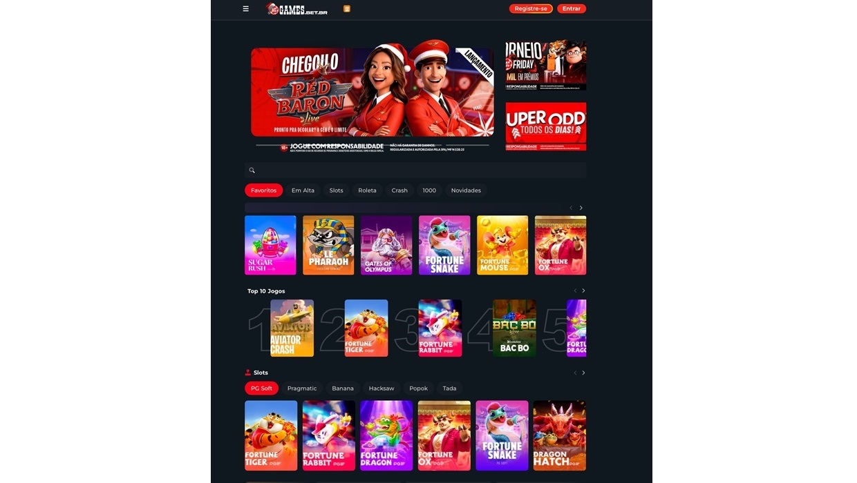 Carrosséis Inteligentes de Jogos: A home agora apresenta linhas horizontais de jogos em destaque, separados por categorias como Favoritos, Em Alta, Slots, Roleta e Crash, permitindo navegação mais organizada e moderna.