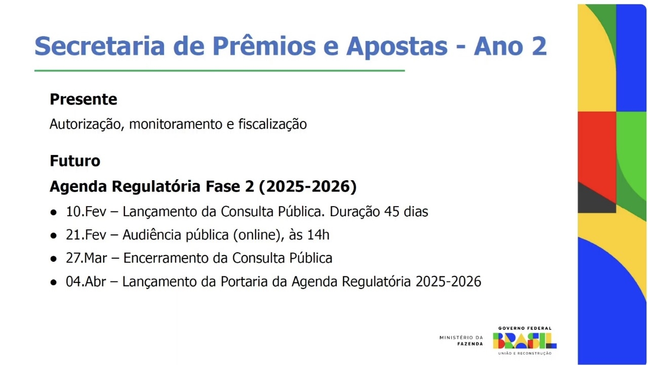 * Projeto 12: Revisão da Portaria SPA/MF nº 300/2024, que regulamenta requisitos e procedimentos de reconhecimento a certificadoras dos sistemas de apostas, dos estúdios de jogo ao vivo e dos jogos online