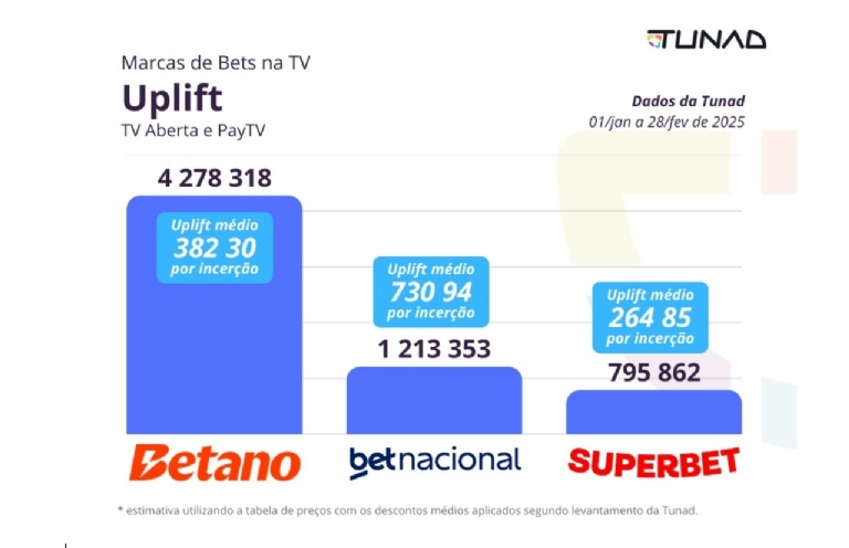 A Betano foi a marca que registrou o maior crescimento nas buscas impulsionado pelos comerciais. Já a Betnacional ficou em segundo lugar no total de uplift, mas, quando analisado o uplift médio (a média de crescimento gerado por inserção), a Superbet superou a concorrente.