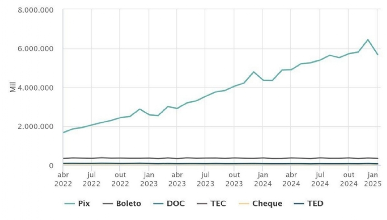 Embora esses cálculos sejam controversos, segundo as Estatísticas de Meio de Pagamento 2024 do BC, com mais de 7 milhões de transações mensais já em janeiro daquele ano, o Pix se consolidou como o meio de pagamento preferido dos brasileiros.