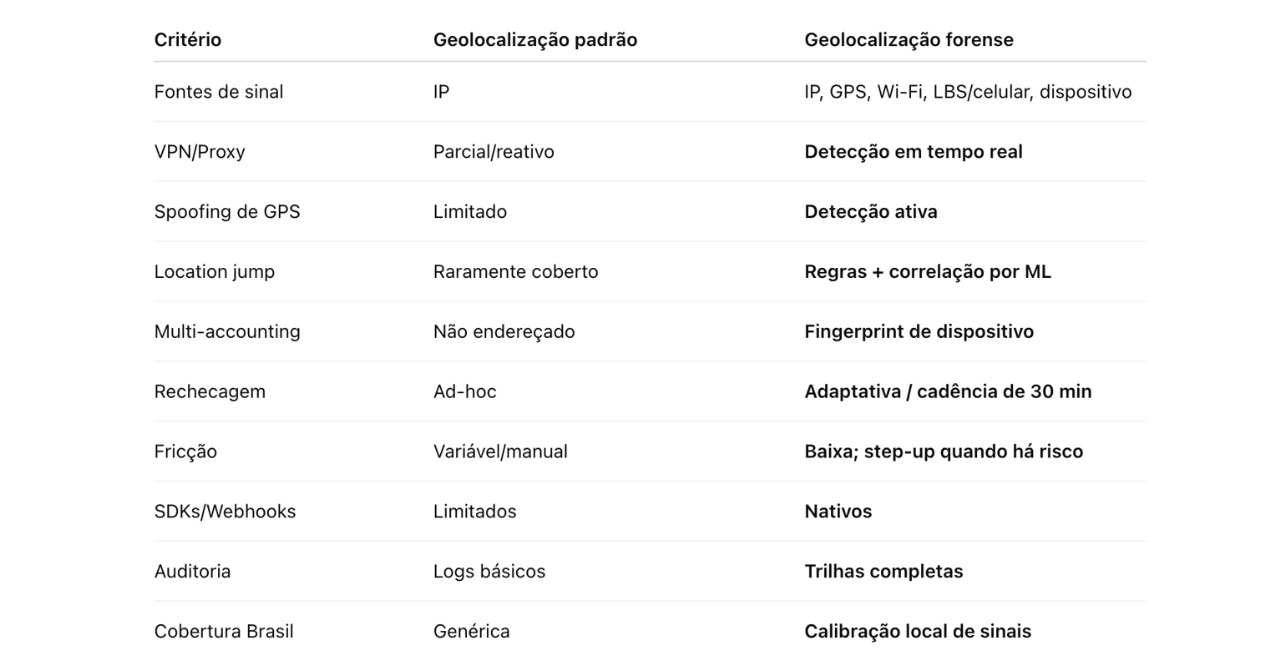 A geolocalização avançada integra várias fontes de sinal, como IP, GPS, Wi-Fi, torres de celular (LBS), e dados de dispositivo, além de aplicar machine learning para detectar inconsistências em tempo real.