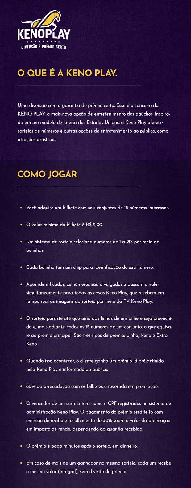 As Keno Play são inspiradas inspirado no sistema de loterias dos Estados Unidos onde, por meio de um sorteio eletrônico de números, os clientes concorrem a 60% da arrecadação de cada jogada, ao mesmo tempo, nas três casas do grupo. Os vencedores dos sorteio terão o nome e CPF registrados no sistema de administração Keno Play, para pagamento de prêmio com emissão de recibo e recolhimento de 30% sobre o valor de premiação em imposto de renda, dependendo da quantia recebida.