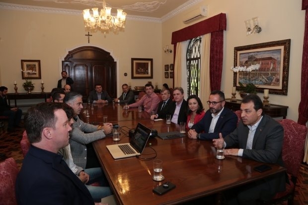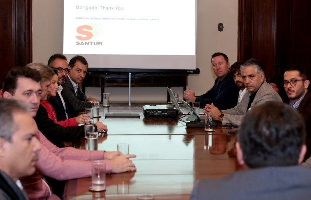 O presidente da Arena Petry, Sandro Petry, a presidente da Santur, Flávia Didomenico, e o secretário de Articulação Internacional, Derian Campos, participaram da reunião, assim como o senador Dario Berger.