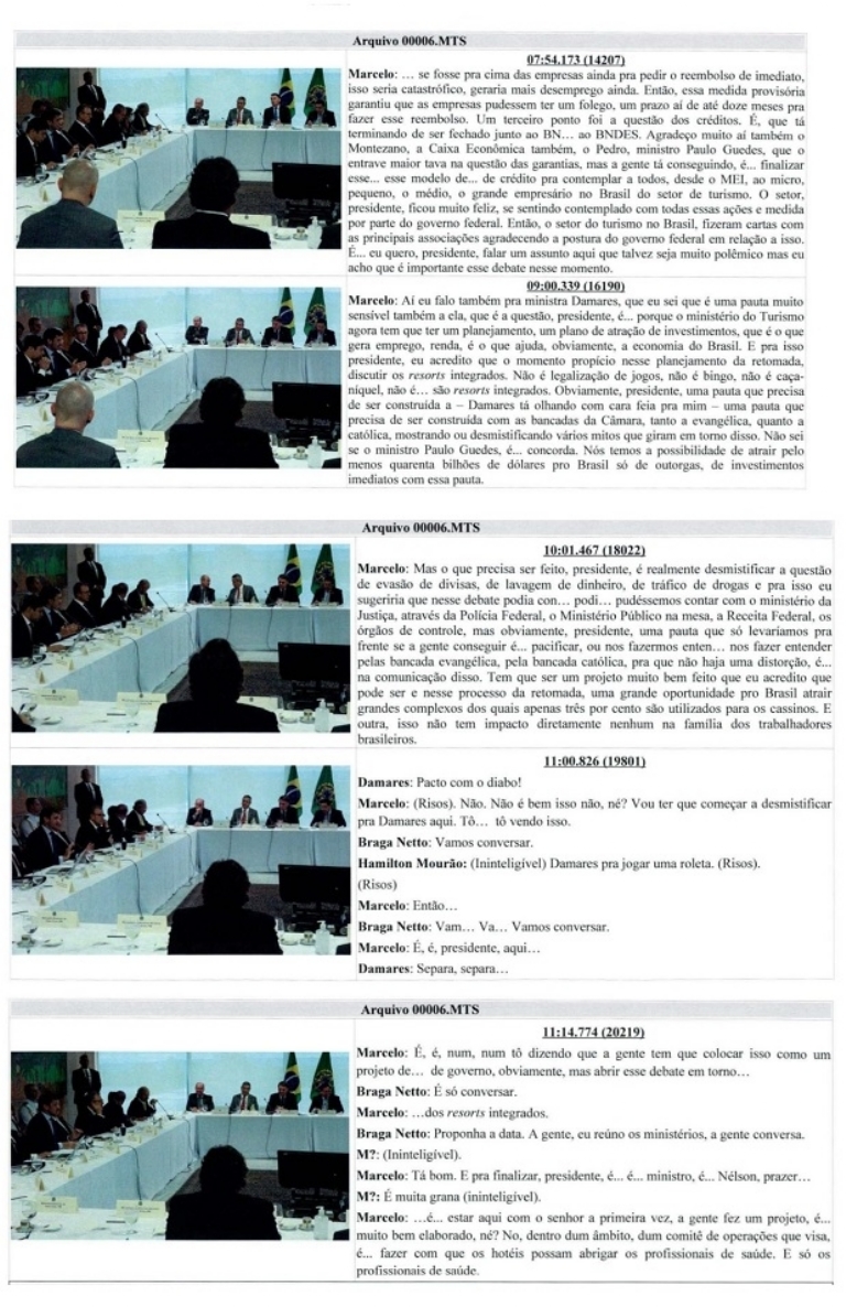 “.. Eu quero, presidente, falar um assunto aqui que talvez seja muito polêmico mas eu acho que é importante esse debate nesse momento. Aí eu falo também pra ministra Damares (a ministra da Mulher, Família e Direitos Humanos Damares Alves), que eu sei que é uma pauta muito sensível também a ela, que é a questão, presidente, é... porque o ministério do Turismo agora tem que ter um planejamento, um plano de atração de investimentos, que é o que gera emprego, renda, é o que ajuda, obviamente, a economia do Brasil. E pra isso presidente, eu acredito que o momento propício nesse planejamento da retomada, discutir os resorts integrados. Não é legalização de jogos, não é bingo, não é caçaníquel, não é... são resorts integrados”, diz o ministro Alvaro Antonio no inicio de seu fala frente ao presidente Bolsonaro e seus colegas das outras pastas.