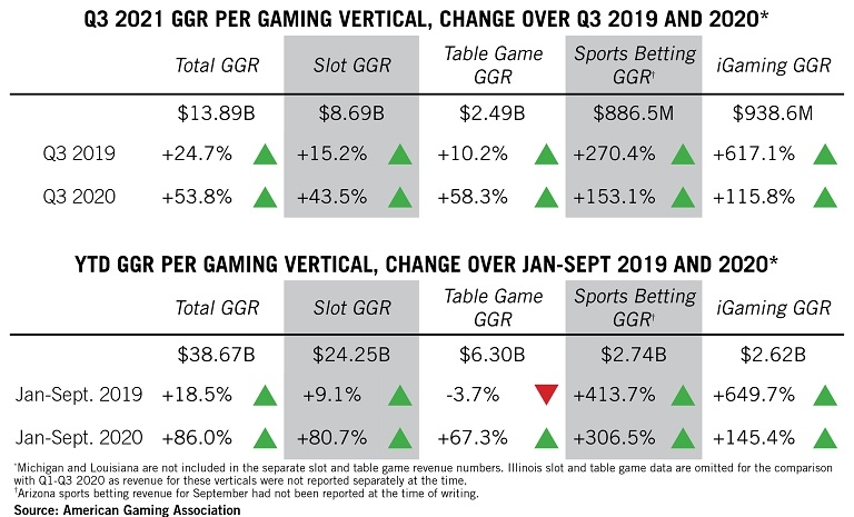 A receita de jogos comerciais do terceiro trimestre de 2021 foi impulsionada pela receita recorde de iGaming de US$ 938,6 milhões. Enquanto isso, a receita das apostas esportivas atingiu uma baixa trimestral em 2021 de US$ 886,5 milhões, devido a um calendário limitado de esportes no final do verão. A receita combinada de apostas esportivas e iGaming nos primeiros nove meses do ano é de US$ 5,36 bilhões, um aumento de mais de 200% ano a ano.