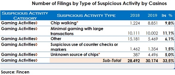 Há uma atividade particular que chegou ao conhecimento do FinCEN como uma "bandeira vermelha" potencial de atividade suspeita, chamada de Chip walking ou "caminhada com fichas", na linguagem dos cassinos