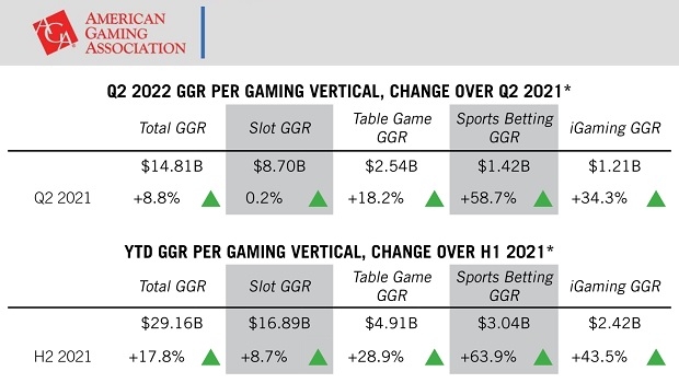 Vinte e duas das 31 jurisdições de jogos comerciais operando durante o mesmo período do ano passado experimentaram aumentos de receita no segundo trimestre de 2022. Nove estados relataram as maiores altas trimestrais de todos os tempos: Arkansas, Iowa, Maryland, Massachusetts, Nevada, Nova York, Oklahoma, Oregon e Pensilvânia.