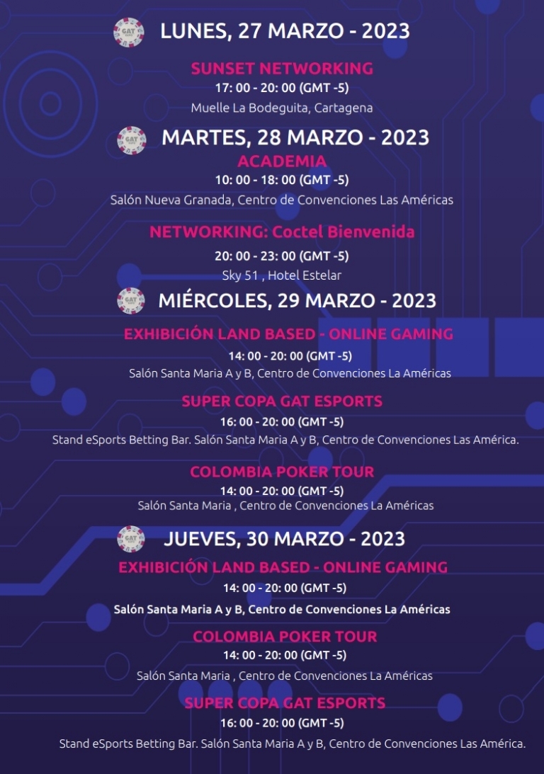 A organização está preparando atividades de networking que começam na segunda-feira 27 de março com um passeio de catamarã ao pôr do sol na Baía de Cartagena, terça-feira 28 será a recepção de boas-vindas na praia do Hotel Las Americas com tambores, cumbia, danças e muita sabor caribenho. Também é anunciado o plantio de árvores e espécies nativas como primeiro passo de uma campanha ambiental com a participação de visitantes e expositores da GAT Expo 2023.