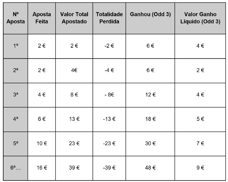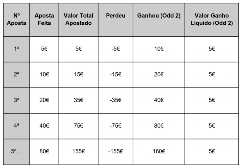 Neste sistema, o apostador deve dobrar a sua aposta inicial em caso de perda. Assim, se a primeira aposta de 5 euros é perdida, de seguida, deverá apostar 10 euros, e assim sucessivamente. No entanto, este tipo de sistema apenas pode ser utilizado em probabilidades iguais ou superiores a dois, sendo que terá de receber sempre o dobro do investido inicialmente. Apenas desta forma conseguirá garantir lucro nas suas apostas quando a previsão realizada é vencedora.