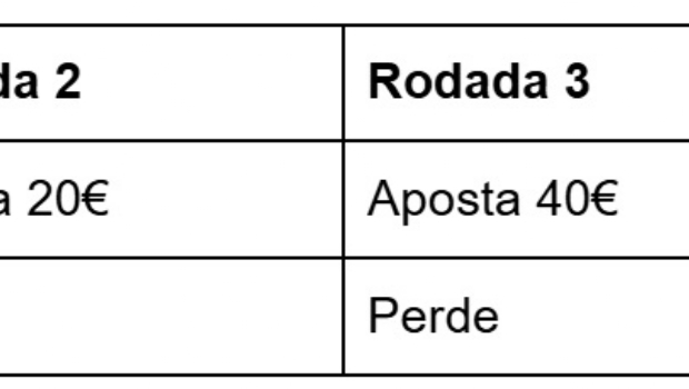 2. Se perder, o jogador dobra o valor da aposta. Ou seja, irá apostar 20€, na próxima rodada (10€x2)