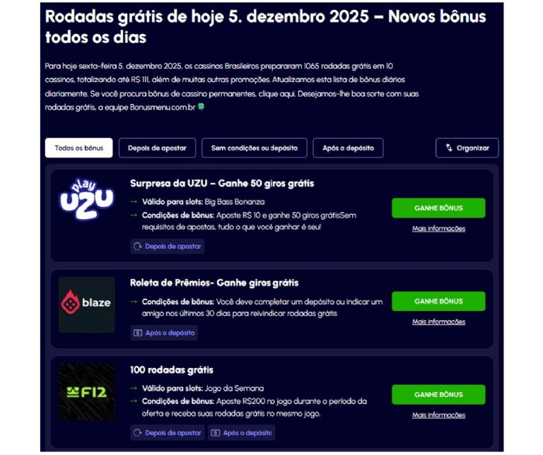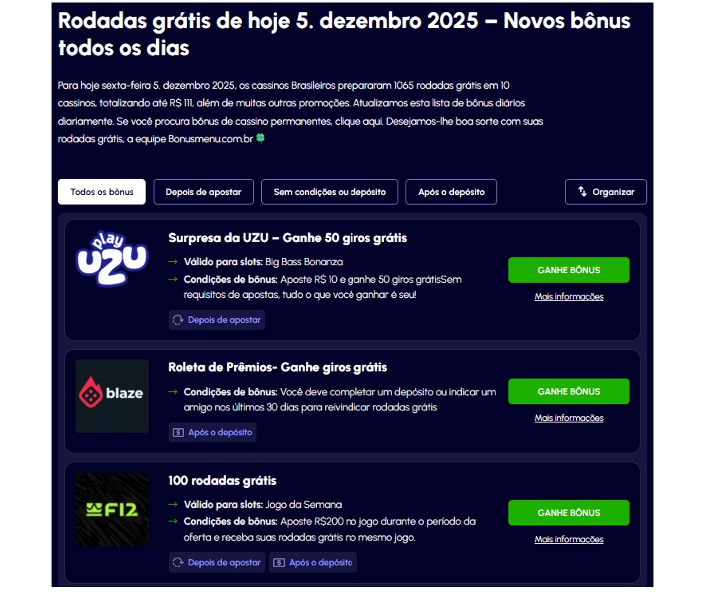Todos os dias, a equipe do BonusMenu monitora cassinos licenciados e publica uma lista real e verificada de bônus e free spins disponíveis naquele dia, algo essencial em um mercado dinâmico como o brasileiro.