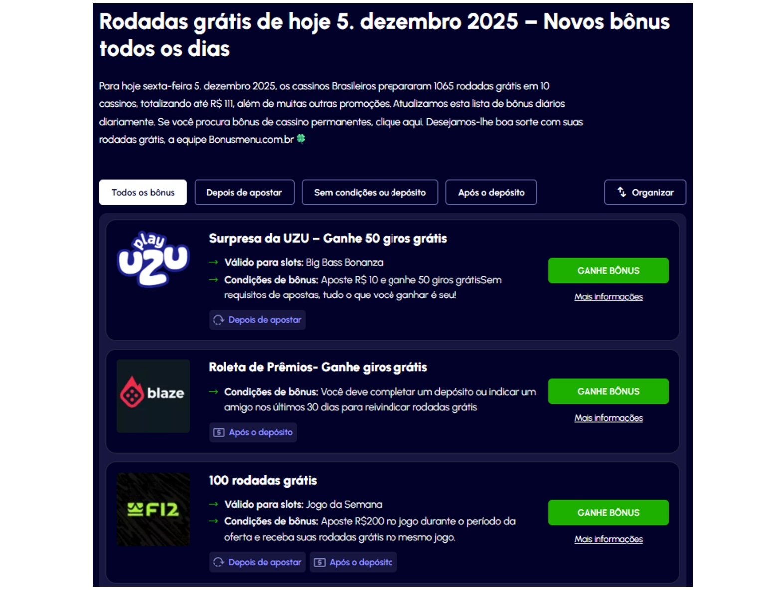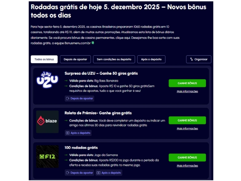 Todos os dias, a equipe do BonusMenu monitora cassinos licenciados e publica uma lista real e verificada de bônus e free spins disponíveis naquele dia, algo essencial em um mercado dinâmico como o brasileiro.