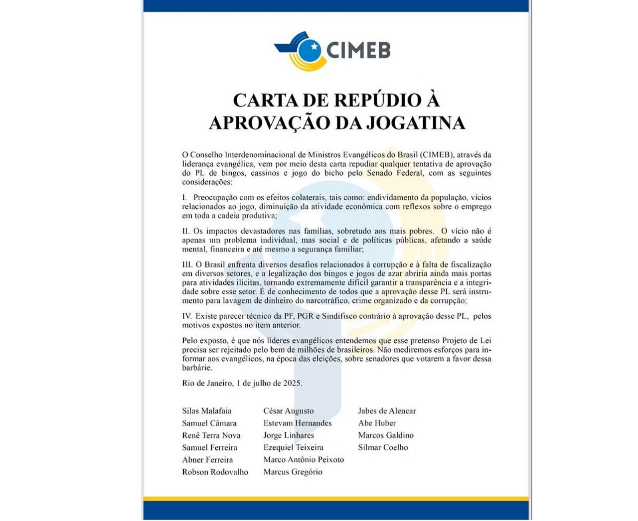 A ofensiva está sendo articulada pelo Grupo Aliança, formado por pastores influentes como Silas Malafaia e Samuel Câmara. O grupo publicou uma “Carta de Repúdio à Aprovação da Jogatina”, que já circula entre senadores e lideranças religiosas, e pretende barrar o avanço da proposta, cuja votação é prevista para ocorrer antes do recesso parlamentar de julho.