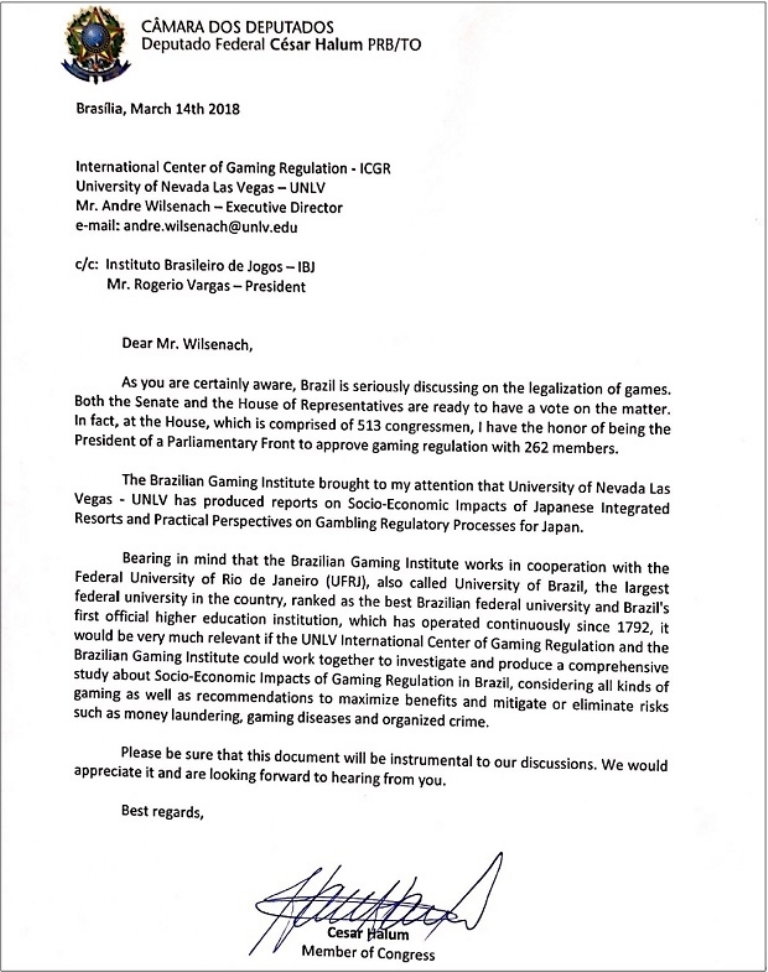 The President of the Parliamentary Front for the approval of the Regulatory Framework of Gaming in Brazil, Deputy Cesar Halum, requested cooperation between the International Center for Game Regulation with the University of Nevada Las Vegas (UNLV) and the Brazilian Games Institute with the Federal University of Rio de Janeiro for the presentation of studies on the best practices of gaming regulation in the world to maximize the generation of employment and income, increase tax collection, protect consumers, treat gamblin addicts, fight organized crime and prevent money laundering.