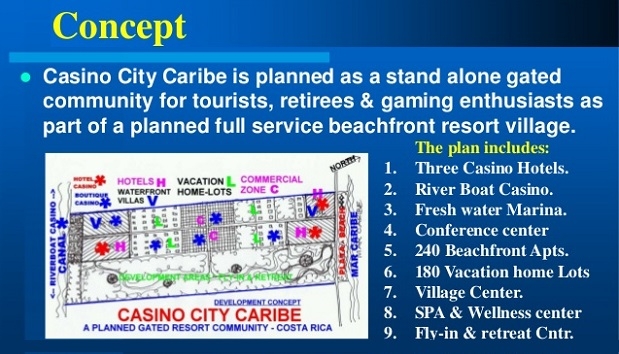 According to The Costa Rica Star newspaper, the project will offer three different casinos and three hotels with a total of 264 rooms. There will also be 219 apartments, two convention centers, a business center, a spa and wellness area and additional recreational facilities. It will have access to the beach, as well as a marina and a heliport.
