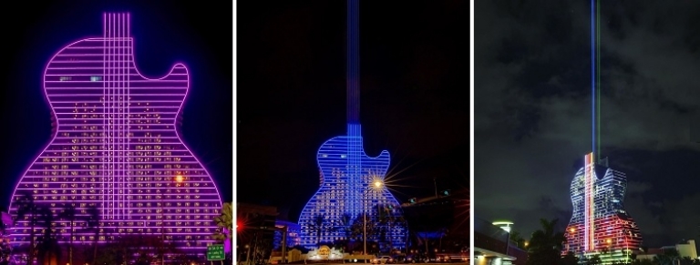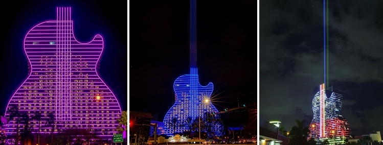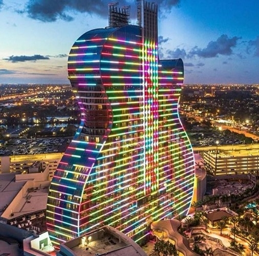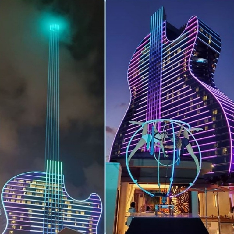 It's a unique addition to South Florida's tourist landscape and no hotel is like it in the world and at night, beams of light will mimic the strings of the guitar.