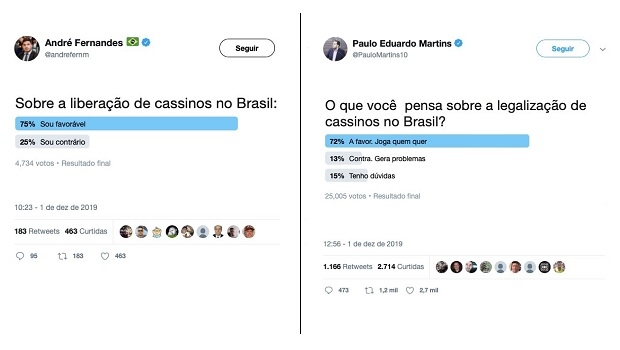 Last Sunday (December 1st), congressman Paulo Eduardo Martins (PSC-PR) published in his official Twitter account a poll that asked: "What do you think about the legalization of casinos in Brazil?" With more than 25,000 entries, 72% of people voted for the "Yes. Play Who Wants" option, 15% on the "I Have Doubts" and only 13% on the "Against. It Generates Problems."