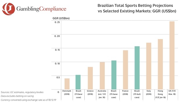 GamblingCompliance estimates Brazil’s land-based and online sports market to be worth approximately US$1.04 billion by year five under a base case scenario. “Under a bull case, we estimate the market to be worth roughly US$1.56 billionn. Online wagering is expected to account for 60-70% of the overall market,” states the report.