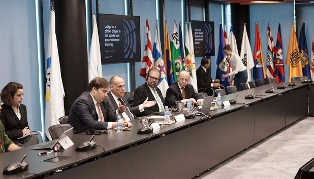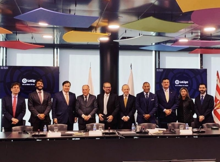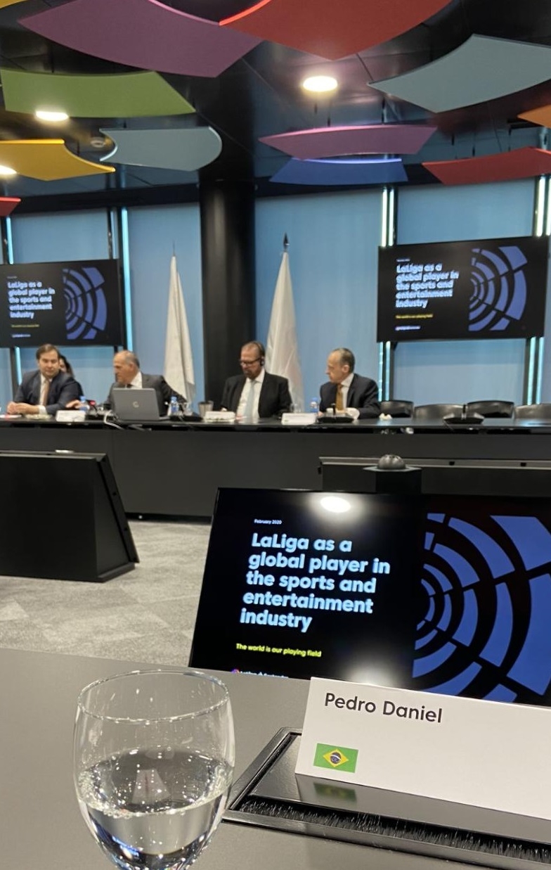 Rodrigo Maia, President of the Chamber of Deputies; Reinaldo Carneiro Bastos, President of the FPF; deputy Pedro Paulo; Mauro Silva, Vice of the FPF; Mislaine Scarelli, Vice President of Administration and Finance of the FPF and Pedro Daniel (EY) participated in the meeting along with representatives of LaLiga such as Javier Tebas, President of the Professional Football League of Spain; José Guerra Álvarez, general director of LaLiga, and members of the legal and international development team.