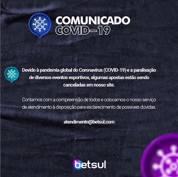 Betsul also used social media to communicate to its players the cancellation of some bets. "We deeply regret the situation and we are rooting for everything to return to normal as soon as possible and without further damage to the world population. #Fiqueemcasa”, they said on Instagram.