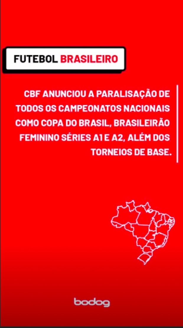 Bodog has posted on the highlights of its Instagram stories informing its punters about the whole situation of the pandemic that affects the games. In one of them, it warns: "CBF announced the interruption of all national championships, such as the Copa do Brasil, Brasileirão women's Series A1 and A2, in addition to the base tournaments."