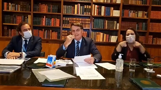 Without a protective mask, Bolsonaro was beside the president of Caixa Econômica Federal, Pedro Guimarães, and the interpreter Elisângela Castelo Branco.