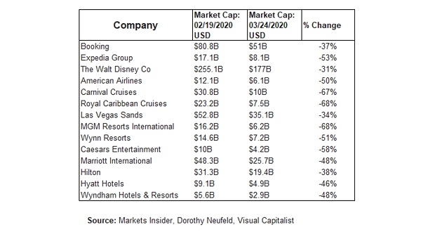 Between february and march 2020, market capitalizations in the so called BEACH industries (Booking, entertainment, airlines, cruises, and hotels) have fell down. The following exhibit depicts this fact.