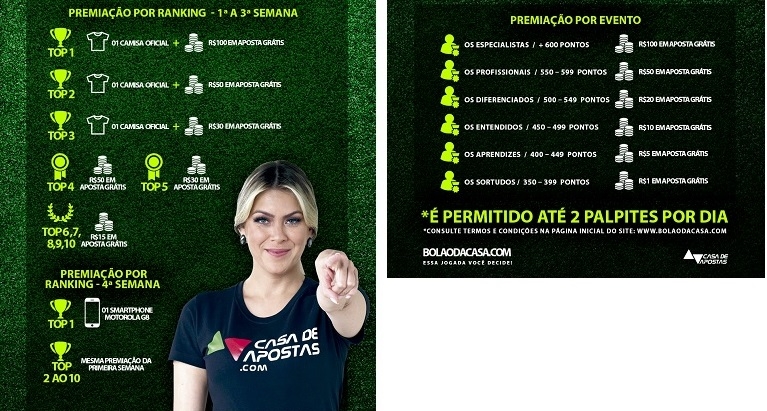 To participate, users have to register for free at https://www.bolaodacasa.com and they will be able to start playing. Users must choose two events every 24 hours and seek the leadership of this game. A ranking will be determined weekly and the leaders of the list will earn rewards such as official shirts of Brazilian clubs and even a smartphone.