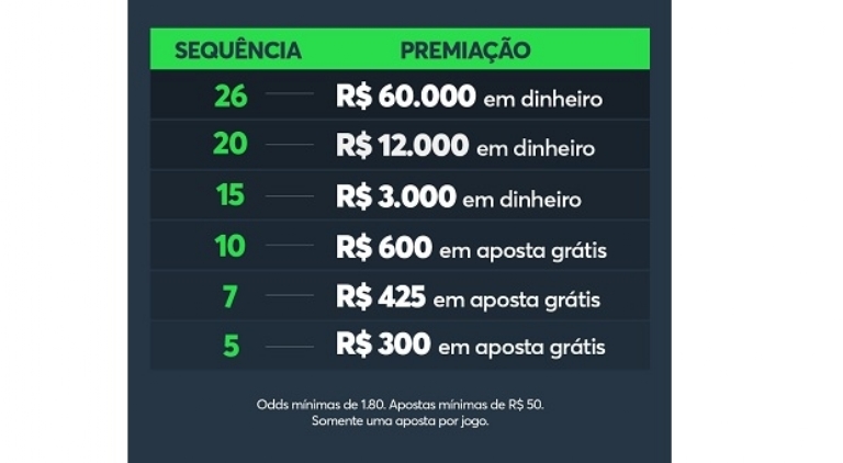 Basically: if the user hits all 26 games fulfilling the criteria above, he takes R$60,000 (US$11.4k) in cash > 20 games in a row: R$12,000 (US$2,270) > 15 games in a row: R$3,000 (US$570).