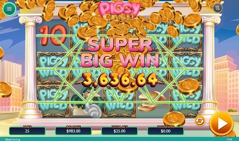 Piggy Cash has 25 paylines with a 5×3 layout. It has a 95.17% return to player (RTP), a volatility of 3/5, a hit ratio of 34.99%, and a maximum win of 1100x the bet.