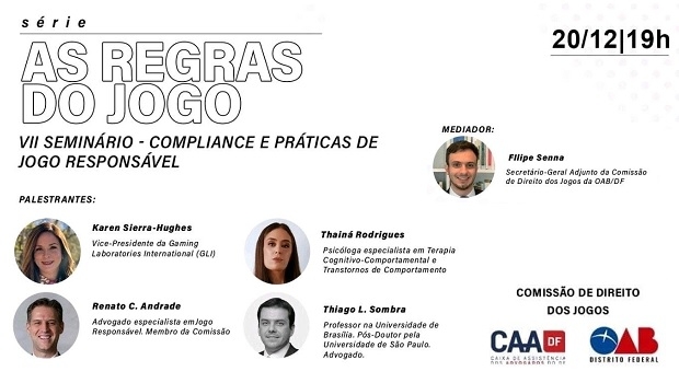 The speakers confirmed for the 7th Seminar of "The Rules of Gaming", with the theme "Compliance and Responsible Gaming Practices", are Karen Sierra-Hughes, from GLI; Renato Andrade, lawyer specializing in responsible gaming and member of the Commission; Thainá Rodrigues, psychologist specialist in Cognitive-Behavioral Therapy and Behavior Disorders; and Thiago L. Sombra, lawyer and professor at the University of Brasília. Filipe Senna, Deputy Secretary General of the OAB/DF Gaming Law Commission, will mediate the webinar.