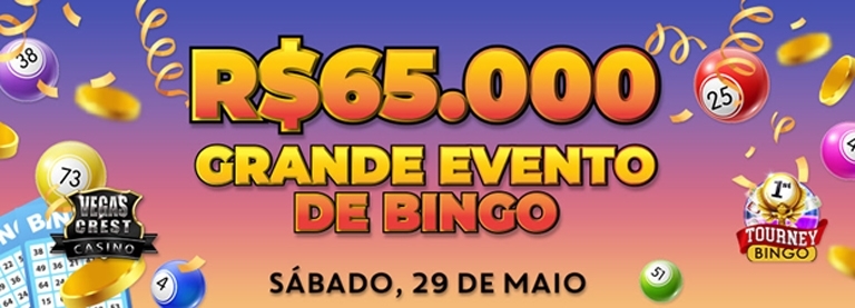 A super bingo prize is promised for May 29, when Vegas Crest Casino will host Big Bingo 65,000. The event starts at 8pm, with three warm-up games of R$ 5,000 each. The main event, a R$ 50,000 guaranteed game, takes place at 11pm.