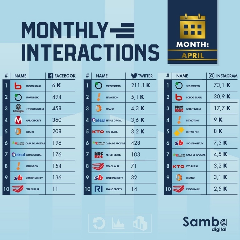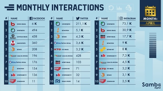 Samba’s analysis included 16 sport betting accounts, all of which have established Portuguese profiles on three major social media platforms: Instagram, Facebook, and Twitter. In April, all 16 Instagram profiles created a total of 164.2 thousand interactions.