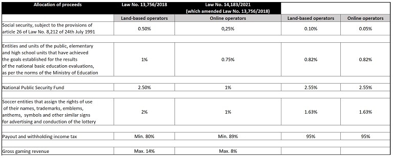 Fortunately, this changed in July 2021 when Law No. 13,756/2018, by means of an Amendment to Provisional Measure No. 1,034/2021, which was converted into Law No. 14,183/2021, whereby gross gaming revenue (GGR), rather than total revenue/turnover, became the basis for calculating the additional tax paid by licensed operators.