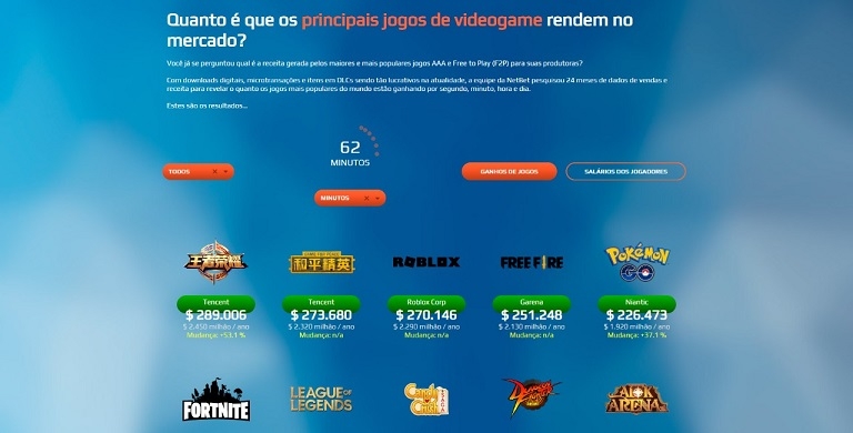 The site presents the data divided into the most profitable by seconds, minutes, hours or days, in addition to being possible to split between free and paid games. To arrive at the values of each title, the survey counted digital sales, expansion sales (DLCs) of games and various microtransactions, for example, for an average of two years, giving a dimension of the financial success of each release.