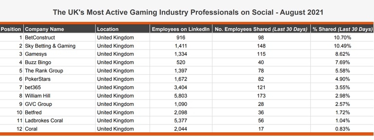 Sky Betting & Gaming takes the second spot and is closely followed by Gamesys on the third. Buzz Bingo, The Rank Group, PokerStars, bet365, William Hill, GVC Group, and Betfred complete the Top 10.
