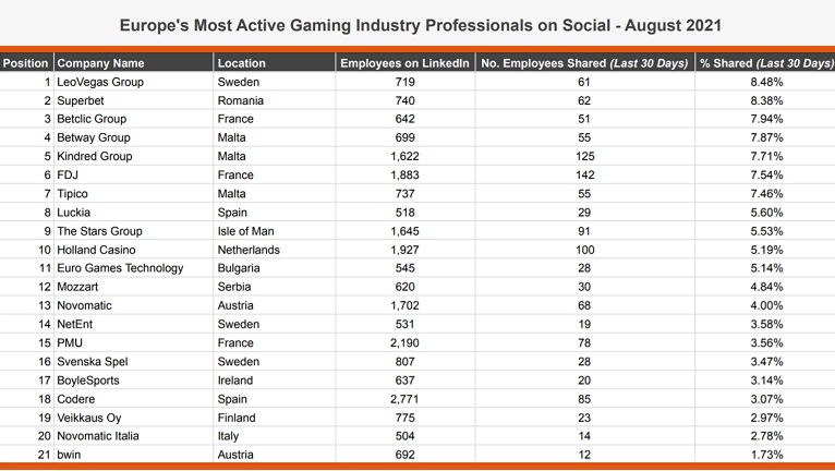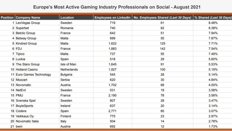 LeoVegas Group secured first place in Europe’s most active gaming industry professionals on social. Superbet takes the second spot and is closely followed by Betclic Group on the third. Then Betway Group, Kindred Group plc, FDJ - La Française des Jeux, Tipico, Luckia, The Stars Group, and Holland Casino, who all made it to the Top 10.