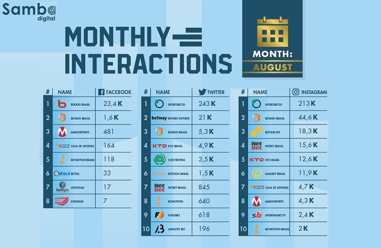 The European bookmaker KTO reaffirmed its strong expansion in Brazil in August, with an important growth in the ranking of two social networks. On twitter, KTO entered the Top 10 (in July it wasn't on the list) and with 4.9k interactions it got the 4th place. On Instagram, the company climbed two places and went from 7th to 5th place in the ranking, with a huge jump in interactions: from 4.4k to 12.6k in just one month.